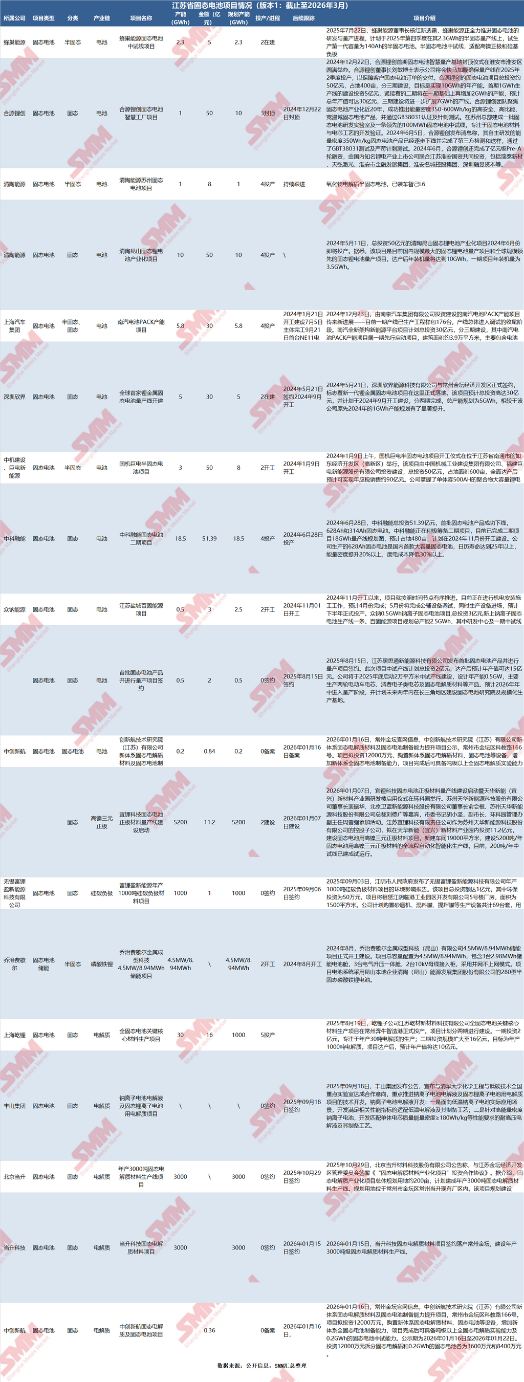 根据公开信息统计,江苏省固态电池及相关材料项目已规划总投资超过400亿元,规划电池产能超过70GWh,覆盖半固态、准固态、全固态多条技术路线。主要项目分布如下:
