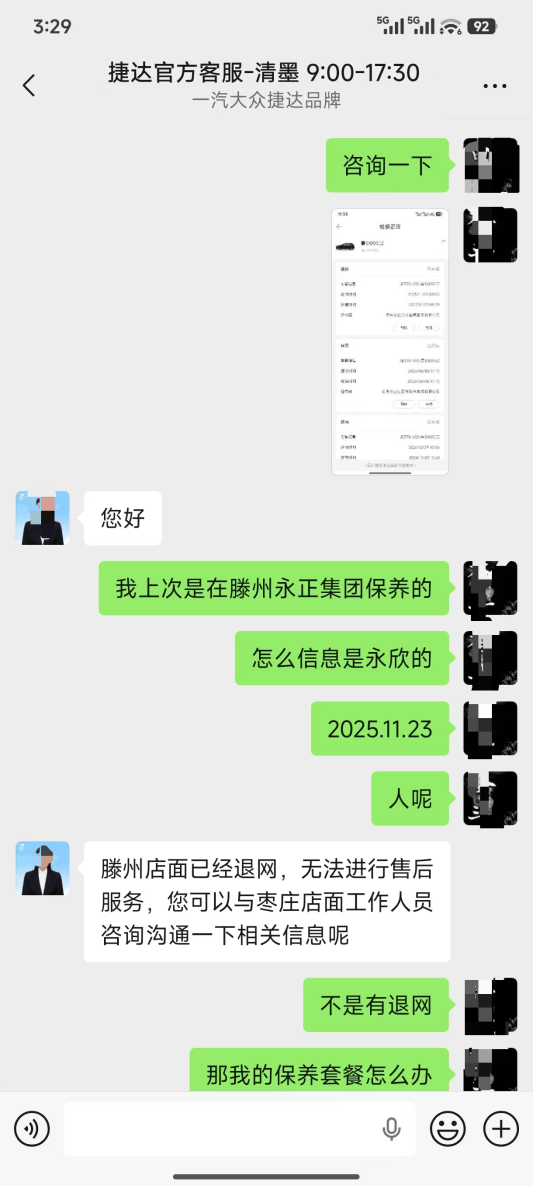 鲁网4月29日讯“我当初就是认准了捷达的官方授权,才放心花5188元买了‘双保无忧’延保套餐,4S店于2024年底关了,厂家不管,保险公司也不给赔,花钱买的保障成了一张废纸。”近日,山东枣庄的捷达VS5车主刘先生(化名)向记者讲述了自己购买官方延保套餐却无法兑现的维权遭遇。