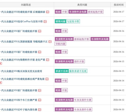 与此同时,记者在车质网公开投诉平台信息发现,捷达VS5车型的变速箱异响顿挫、轮胎大面积开裂等相关投诉密集爆发。有部分车主反馈,其就上述故障前往4S店检修时,被工作人员以“通病”为由敷衍处理,多次维修后问题仍未得到解决。